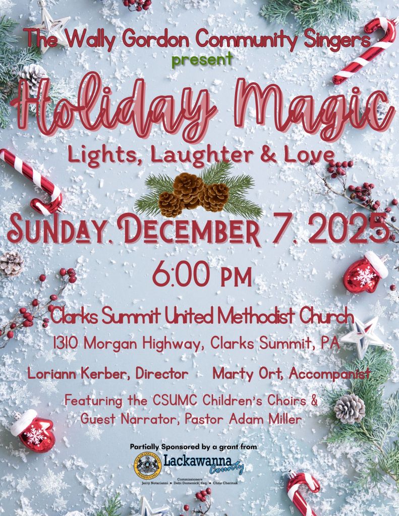 The Wally Gordon Community Singers Winter Concert will be presented on Sunday, December 7, 2025 at 6:00 p.m. at the Clarks Summit United Methodist Church, 1310 Morgan Highway. We will be singing some of your favorite holiday songs, along with the NOEL (Night of Everlasting Love) which is the music used for the Walt Disney World Candlelight Processional in EPCOT. Featured guests include the Celestial/Chapel Choirs from the Clarks Summit United Methodist Church, and instrumentalists that will form a fantastic orchestra to accompany the choir.
