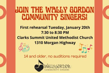 The Wally Gordon Community Singers Spring Concert will be presented on Saturday, May 16, 2026. The theme is “The Magic of Disney!” Rehearsals begin on Tuesday, January 20th at 7:30 pm at the Clarks Summit United Methodist Church. No auditions required! We would love to have you join us!